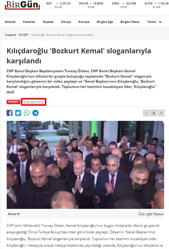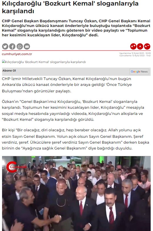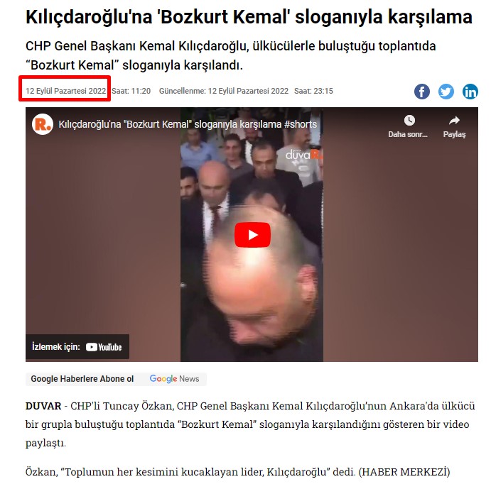 Görüntüleri incelemek için anahtar kelimelerle arama motorlarında arama yaptığımızda görüntülerin güncel olmadığı sonucuyla karşılaşıyoruz. Araştırmamızda, CHP İzmir Milletvekili Tuncay Özkan’ın Twitter hesabından yaptığı paylaşım görülüyor. Özkan, 11 Eylül 2022’de “Genel Başkanımız Kılıçdaroğlu “Bozkurt Kemal” sloganlarıyla karşılandı Toplumun her kesimini kucaklayan lider Kılıçdaroğlu” notuyla ilgili videoyu paylaşmış.