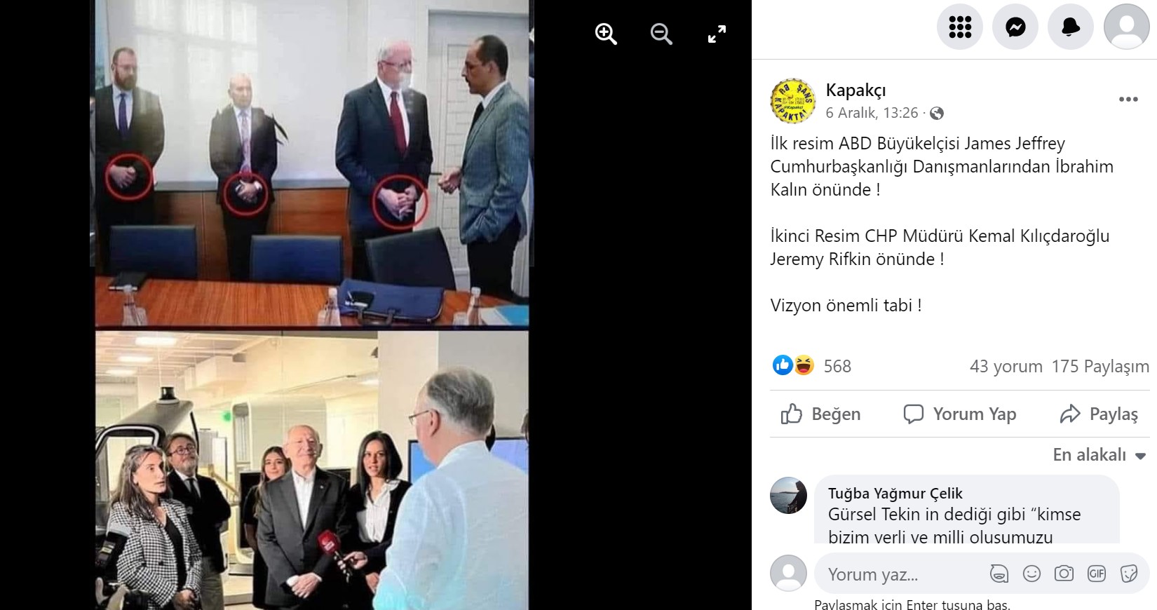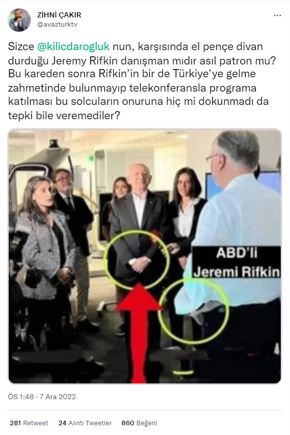 CHP’nin 3 Aralık 2022’de düzenlediği “İkinci Yüzyıla Çağrı” programında konuşan isimlerden birisi de ABD’li ekonomist Jeremy Rifkin’di. Sosyal medyada paylaşılan bir fotoğraf, Kılıçdaroğlu’nun Rifkin’in karşısında ellerini bağlayarak durduğunu gösterdiği iddiasıyla paylaşılıyor.