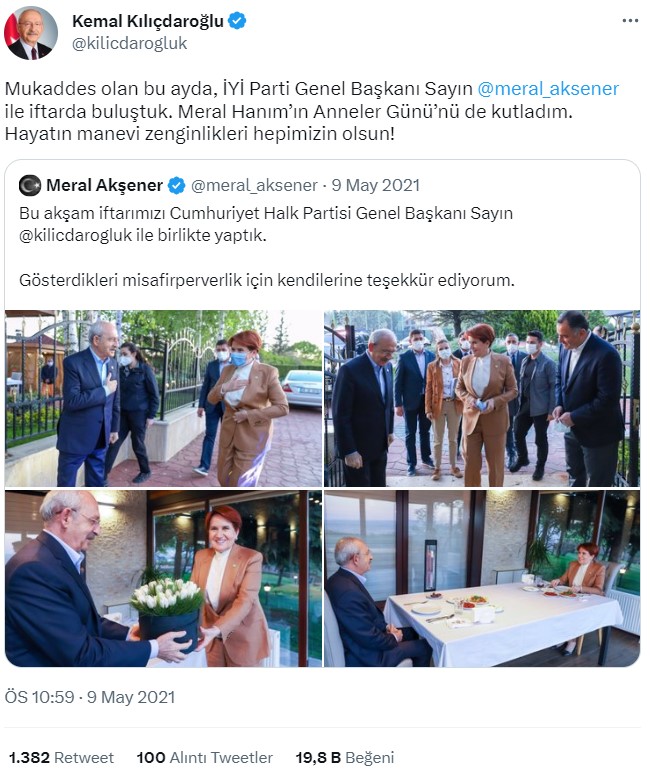 - Kemal Kılıçdaroğlu, 9 Mayıs Anneler Günü olması sebebiyle Meral Akşener’in anneler gününü kutlamış.