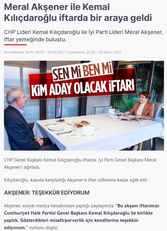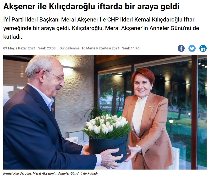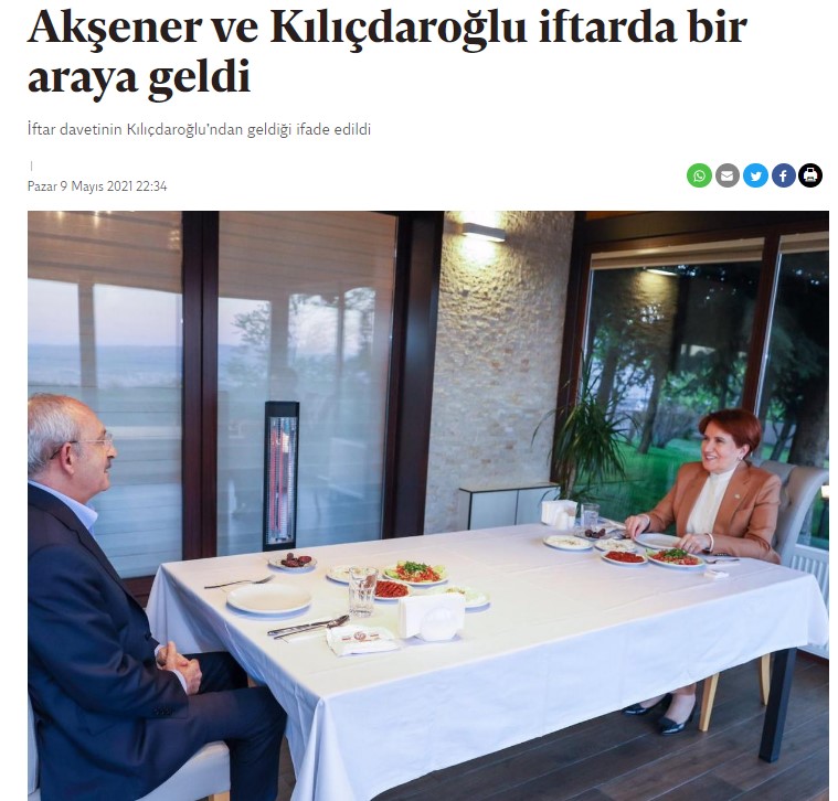 - Fotoğraf 9 Mayıs 2021’de CHP Genel Başkanı Kemal Kılıçdaroğlu ile İYİ Parti Genel Başkanı Meral Akşener’in iftar yemeği buluşmasında kaydedilmiş.
