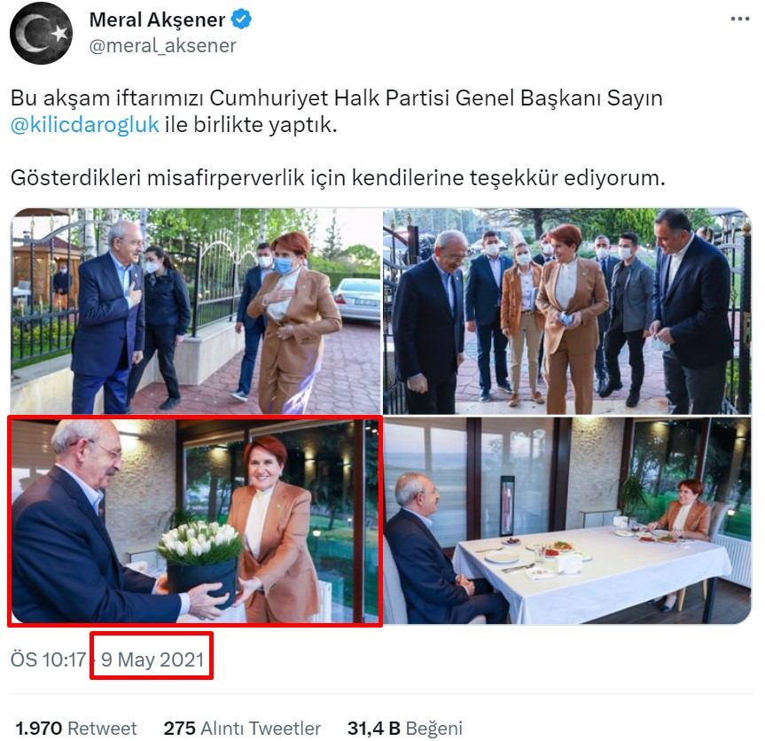 Haber kaynaklarında da belirtildiği üzere fotoğrafın 9 Mayıs 2021’de CHP Genel Başkanı Kemal Kılıçdaroğlu ve İYİ Parti Genel Başkanı Meral Akşener’in iftar yemeğinde buluştuğu güne ait olduğunu anlıyoruz. Bununla birlikte Kemal Kılıçdaroğlu, Anneler Günü olması sebebiyle Meral Akşener’e çiçek vermiş.