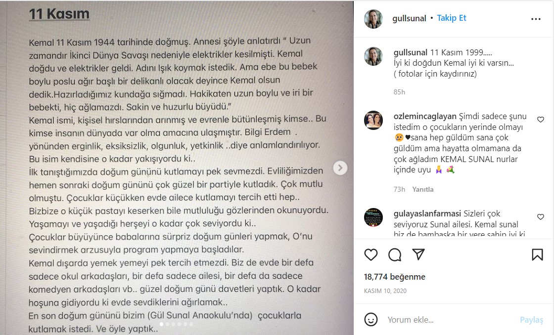 2020 senesinde Kemal Sunal’ın oğlu Ali Sunal ve eşi Gül Sunal tarafından yapılan Instagram paylaşımları oyuncunun doğum gününe dair şüpheye yer bırakmıyor. Gül Sunal, Kemal Sunal’ın annesinden dinlediği doğum hikayesini tüm detaylarıyla anlatıyor.