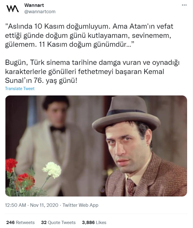 3 Temmuz’da vefatının 22. yılı sebebiyle anılan Kemal Sunal hakkında sosyal medyada pek çok paylaşım yapıldı. Sunal’a ait sözler, anılar ve resimler paylaşılırken dikkat çeken hikayelerden biri de doğum günüyle ilgili olandı. İddiaya göre Kemal Sunal aslında 10 Kasım doğumlu olmasına rağmen Mustafa Kemal Atatürk’ün vefat ettiği günde kutlama yapamayacağını söyleyerek 11 Kasım’ı doğum günü olarak belirlemiş. Kemal Sunal hayranları tarafından beğenilen bu hikaye de sıklıkla paylaşılmış.