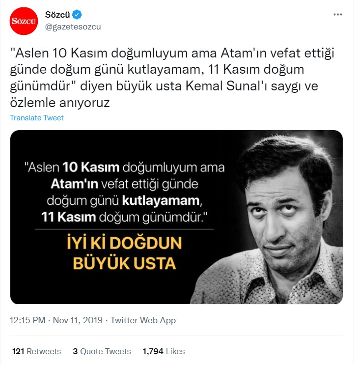 Daha önceki yıllarda da aynı hikayenin hem sosyal medya kullanıcıları hem haber kaynakları tarafından Kemal Sunal’ın doğum gününü anmak amacıyla sıklıkla paylaşıldığını görüyoruz. Peki yıllardır yayılımda olan Kemal Sunal’ın gerçek doğum gününün 10 Kasım olduğu iddiası gerçeği yansıtıyor mu?