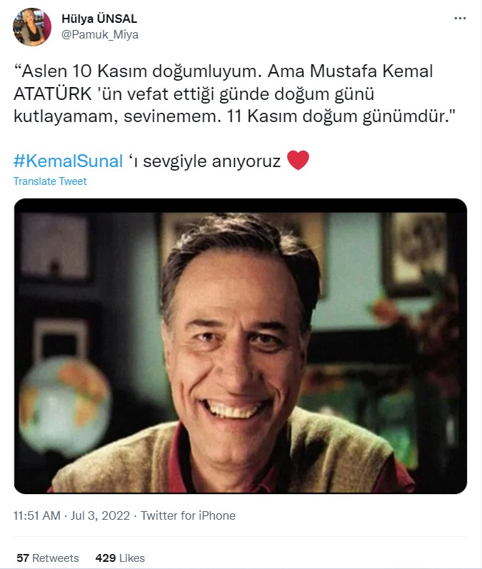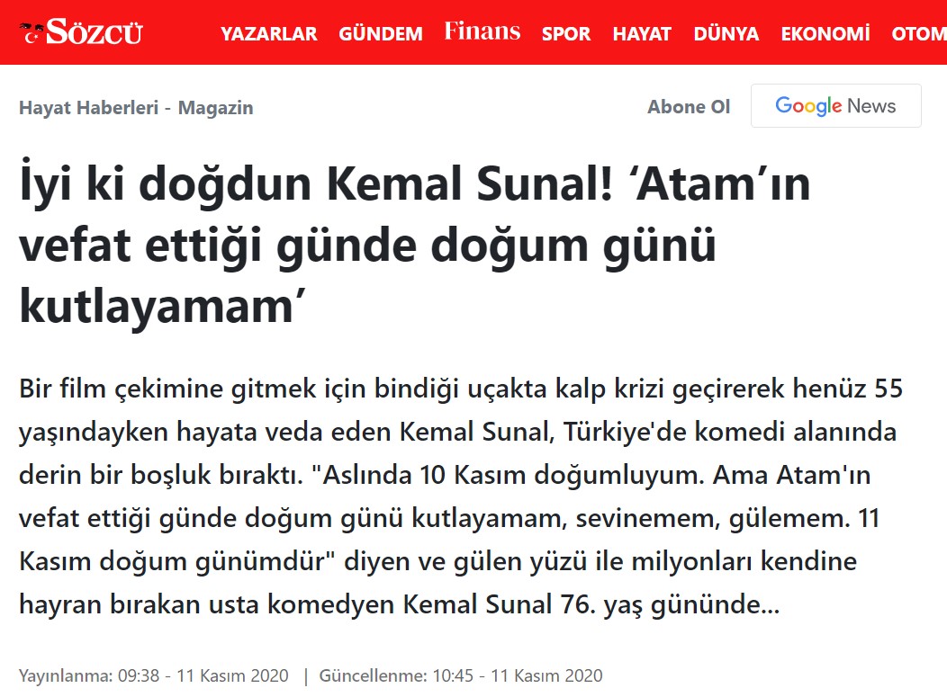 Öte yandan, Ali Sunal 2019’da verdiği bir röportajda ‘Tabii ki Atatürk’e büyük bir sevgi ve saygısı vardı ama babam 11 Kasım’da doğdu’ sözleriyle Kemal Sunal’ın gerçek doğum tarihinin 11 Kasım olduğunu belirtiyor.