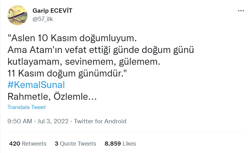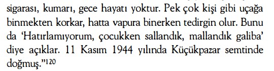 ” ‘Atatürk’e ayıp etmemek’ için değil, ağız tadıyla doğum gününü kutlamak için bir gün rötarlı doğdu (11 Kasım 1944).”