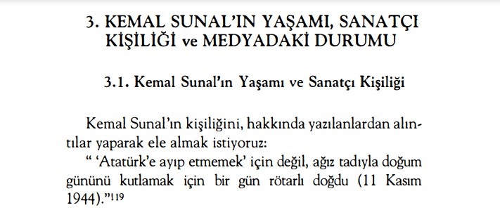 Kemal Sunal’ın gerçek doğum gününü öğrenmek amacıyla öncelikle kendi tez çalışması olan ve sonradan kitaplaştırılan ‘TV ve Sinema’da Kemal Sunal Güldürüsü’ isimli eserine başvurduk. Sunal, tezinde kendisi hakkında yazılanları araştırmayı ve dönemin Türk sinemasının incelemeyi amaçlıyor. Bu nedenle çalışmanın içeriğinde kendisiyle yapılan birçok söyleşi yer alıyor. ‘Kemal Sunal’ın Yaşamı ve Sanatçı Kişiliği’ bölümünde röportajlarında oyuncu hakkında söylenen şu ifadeler dikkat çekiyor: