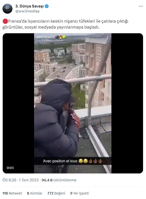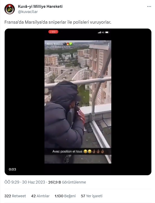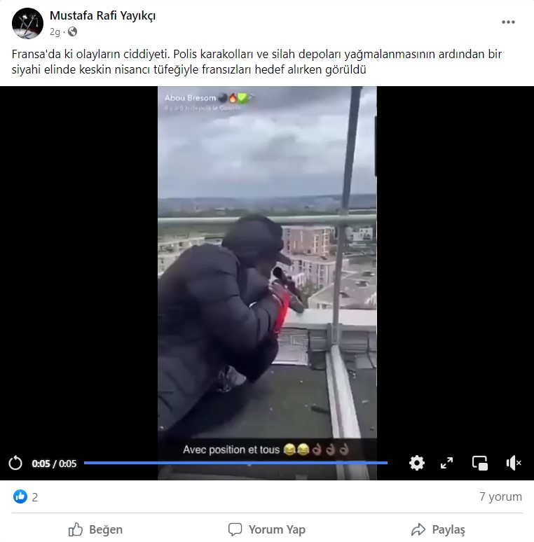 30 Haziran’da Fransa’daki protestoda çekildiği iddiasıyla paylaşılan bir tweet’in altında Twitter not düşmüş. Bu nota göre videodaki gerçek bir tüfek değil.