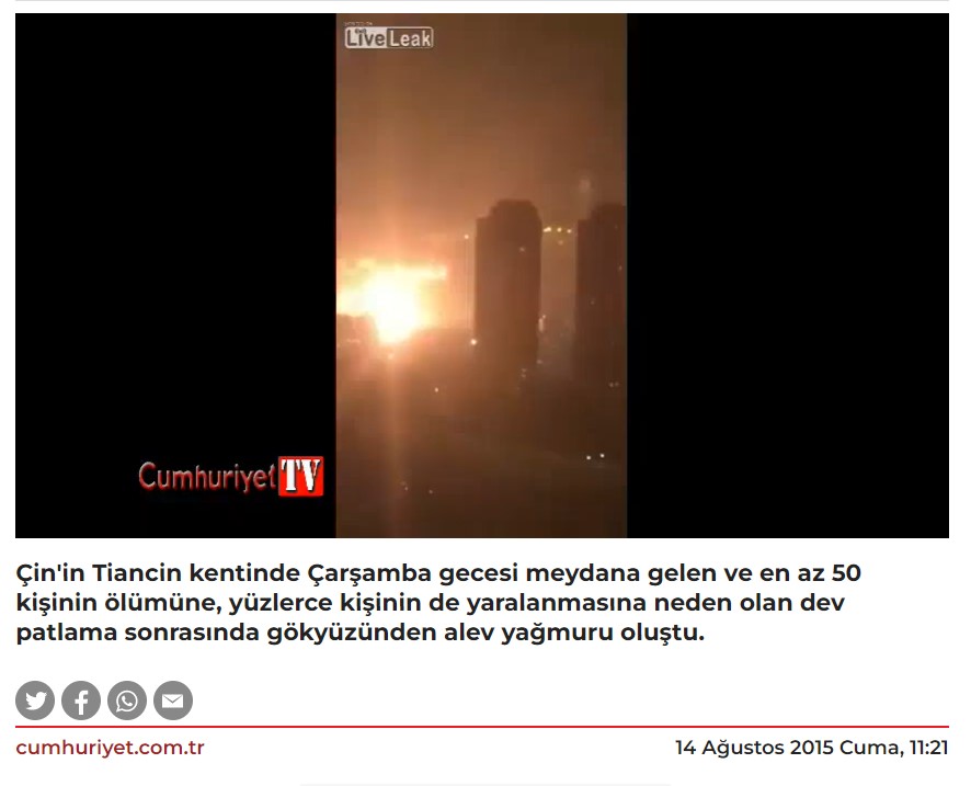 Cumhuriyet’in haberini gördükten sonra YouTube üzerinden “2015 Tianjin explosions” araması yaptık. Arama sonucunda BBC’nin ilgili patlama videosunu 2015 yılında paylaştığını gördük. Videonun açıklama kısmına, Çin’in Tianjin kentinde tehlikeli maddelerin işlendiği limanda patlama olduğu yazılmış. Patlama sonucunda birçok kişinin öldüğü, yüzlerce kişinin yaralandığı belirtilmiş.