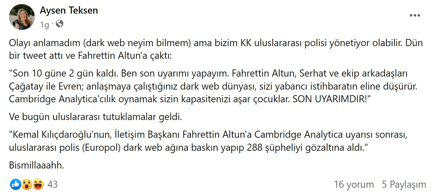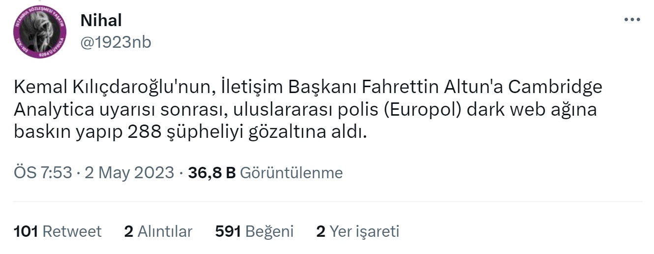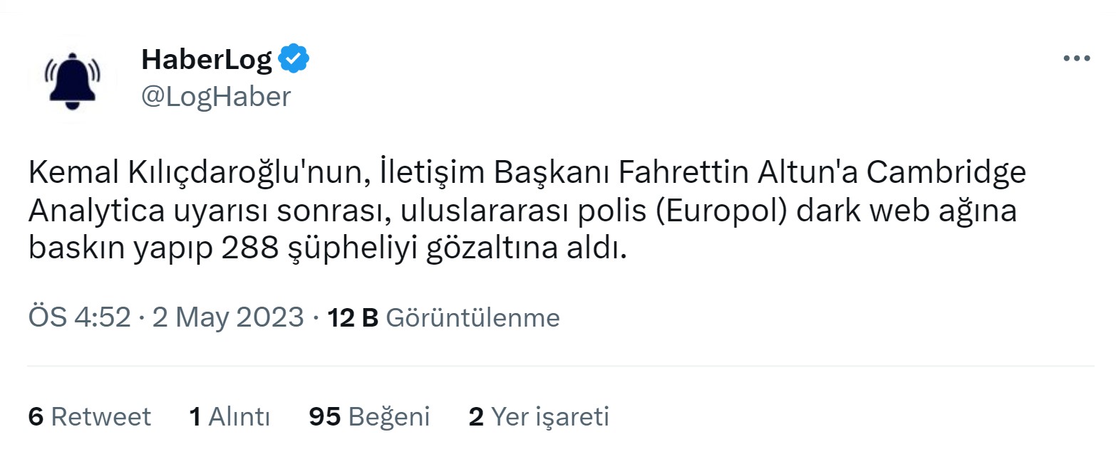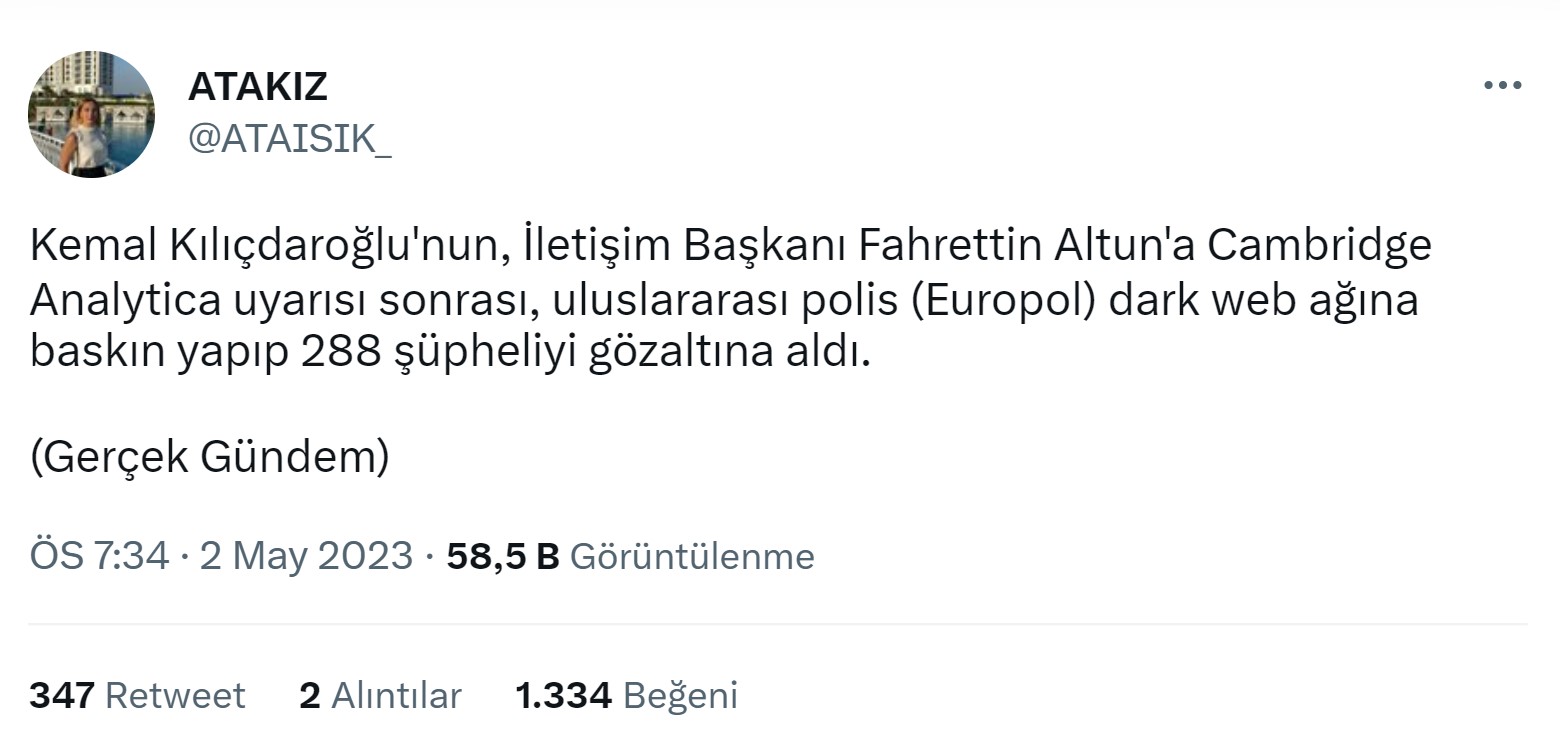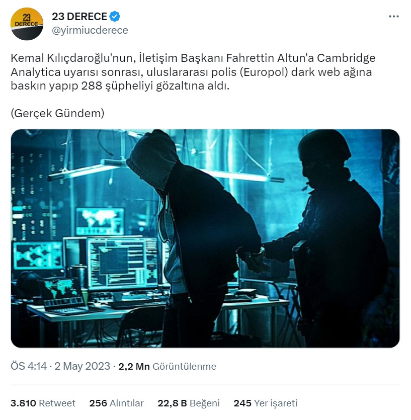 1 Mayıs’ta bunlar yaşanırken 2 Mayıs’tan itibaren Kemal Kılıçdaroğlu’nun, İletişim Başkanı Fahrettin Altun’a yaptığı Cambridge Analytica uyarısı sonrası, uluslararası polisin (Europol) dark web ağına baskın yapıp 288 şüpheliyi gözaltına aldığı iddiası yayılmaya başladı.
