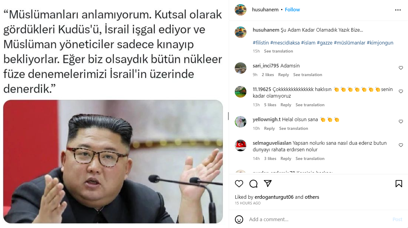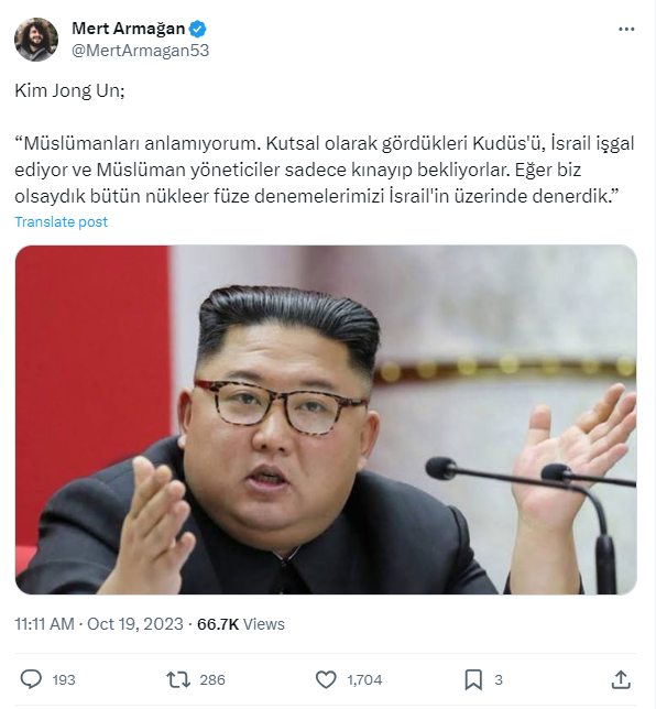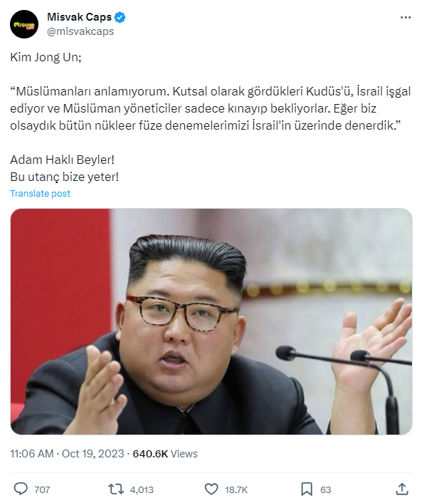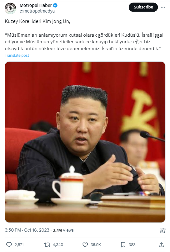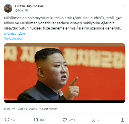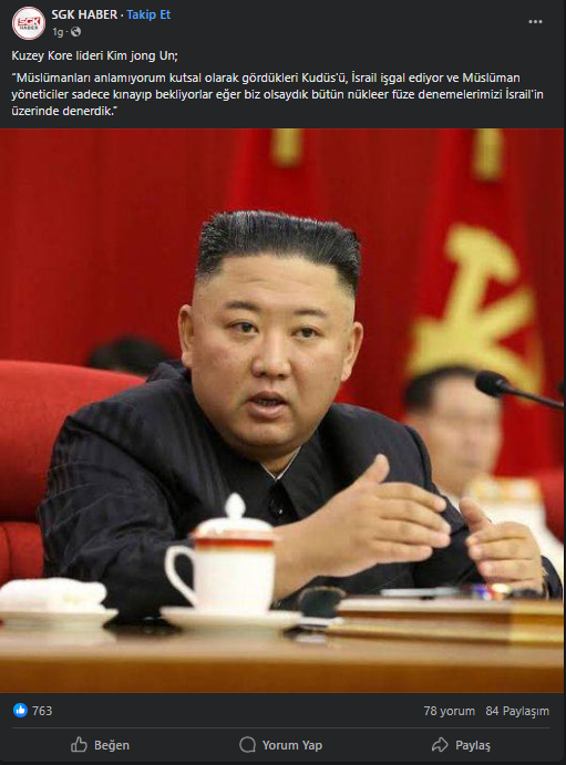 İddialara göre, Kim Jong-Un ‘Müslümanları anlamıyorum kutsal olarak gördükleri Kudüs’ü, İsrail işgal ediyor ve Müslüman yöneticiler sadece kınayıp bekliyorlar. Eğer biz olsaydık bütün nükleer füze denemelerimizi İsrail’in üzerinde denerdik.’ ifadelerini kullandı.