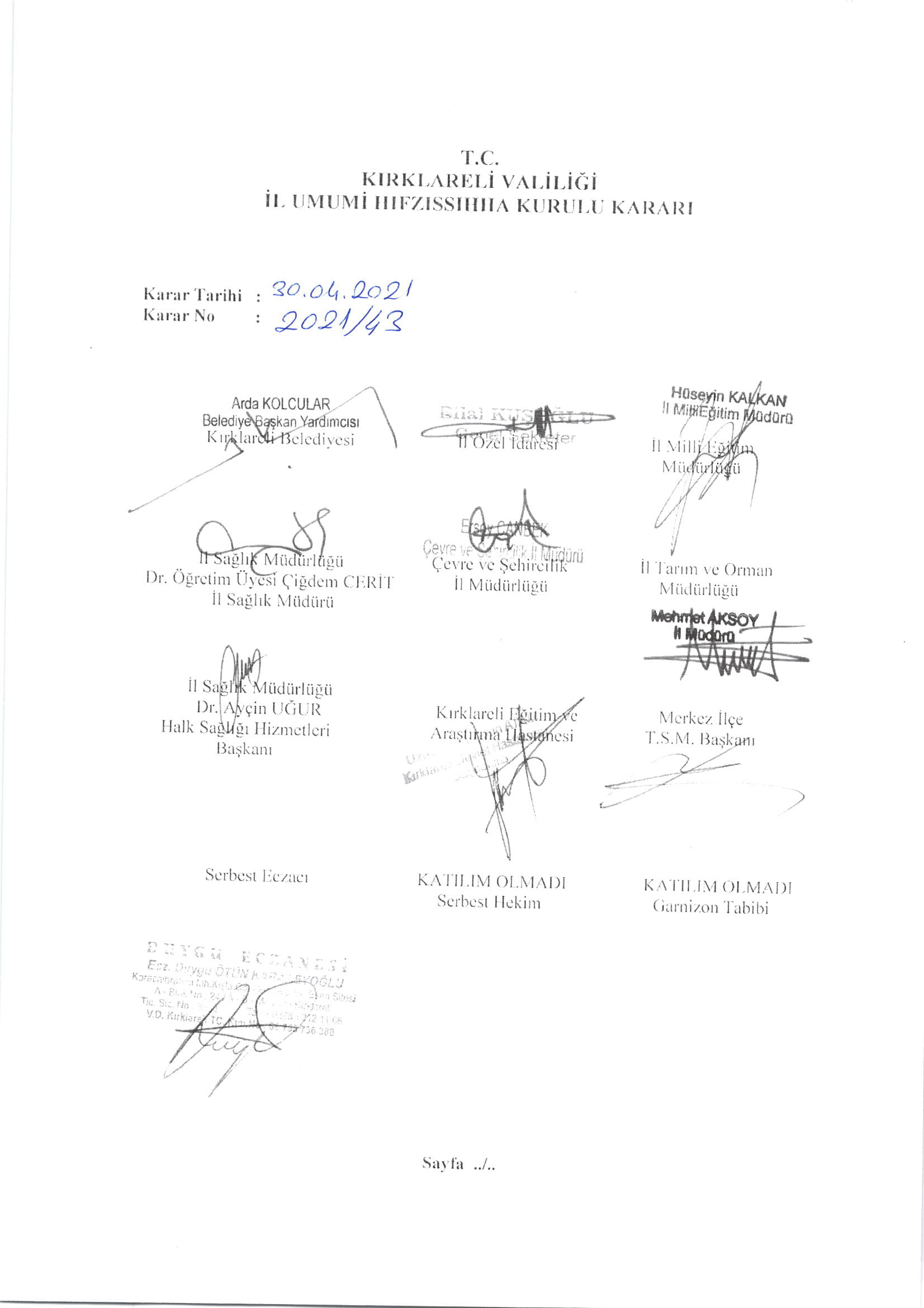 - Yayımlanan belgenin ilk halinde Kırklareli Belediye Başkan Yardımcısı Arda Kolcuların imzası vardır. Kolcular’ın diğer resmi evraklardaki imzaları, söz konusu karardaki imzasıyla aynıdır. Belgenin güncel halinde Kolcular’ın imzası yoktur. İlk belgede imzası olan serbest eczacı üyesinin imzası ikinci belgede yoktur. İkinci belgede, İl Tarım ve Orman İl Müdürlüğü, Çevre ve Şehircilik İl Müdürlüğü, Kırklareli Eğitim ve Araştırma Hastanesi adına imza atan isimler farklıdır.