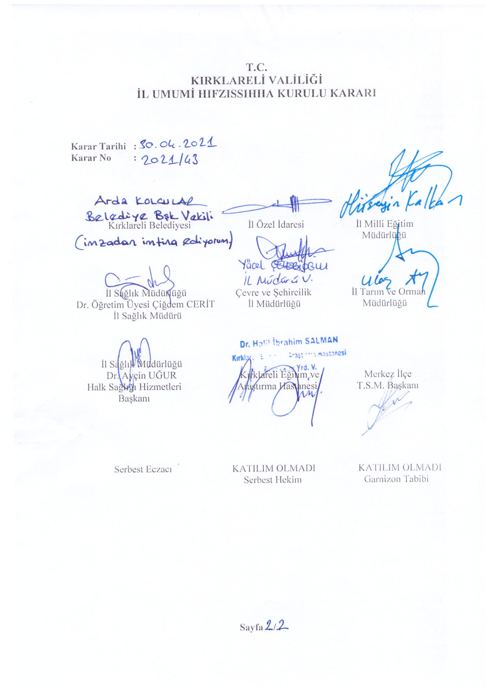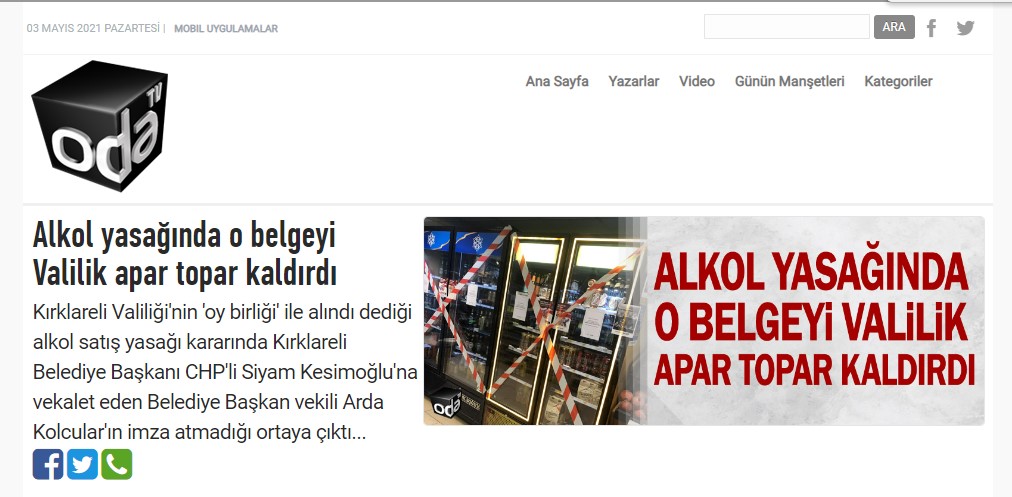 30 Nisan 2021’de Kırklareli Valiliği web sitesinden 2021/43 sayılı, alkol satış yasağıyla ilgili hıfzıssıhha kurulu kararını yayımladı. 12 üyeden 3’ünün imzasının olmadığı kararda, Kırklareli Belediyesi Başkan Yardımcısı Arda Kolcular dahil 9 üyenin imzası vardı. Daha sonra valilik tarafından söz konusu karar güncellendi. Güncel kararda, ilk belgede imzası olan Arda Kolcuların isminin üzerinde ‘imzadan imtina ediyorum’ ifadesi yer aldı. Konu medyaya da yansıdı. ‘Valilik apar topar kaldırdı’ başlığıyla yayımlanan Odatv’nin haberinde, Kırklareli Belediye Başkanı Kolcular’ın belgeye imza atmadığı iddia edildi.