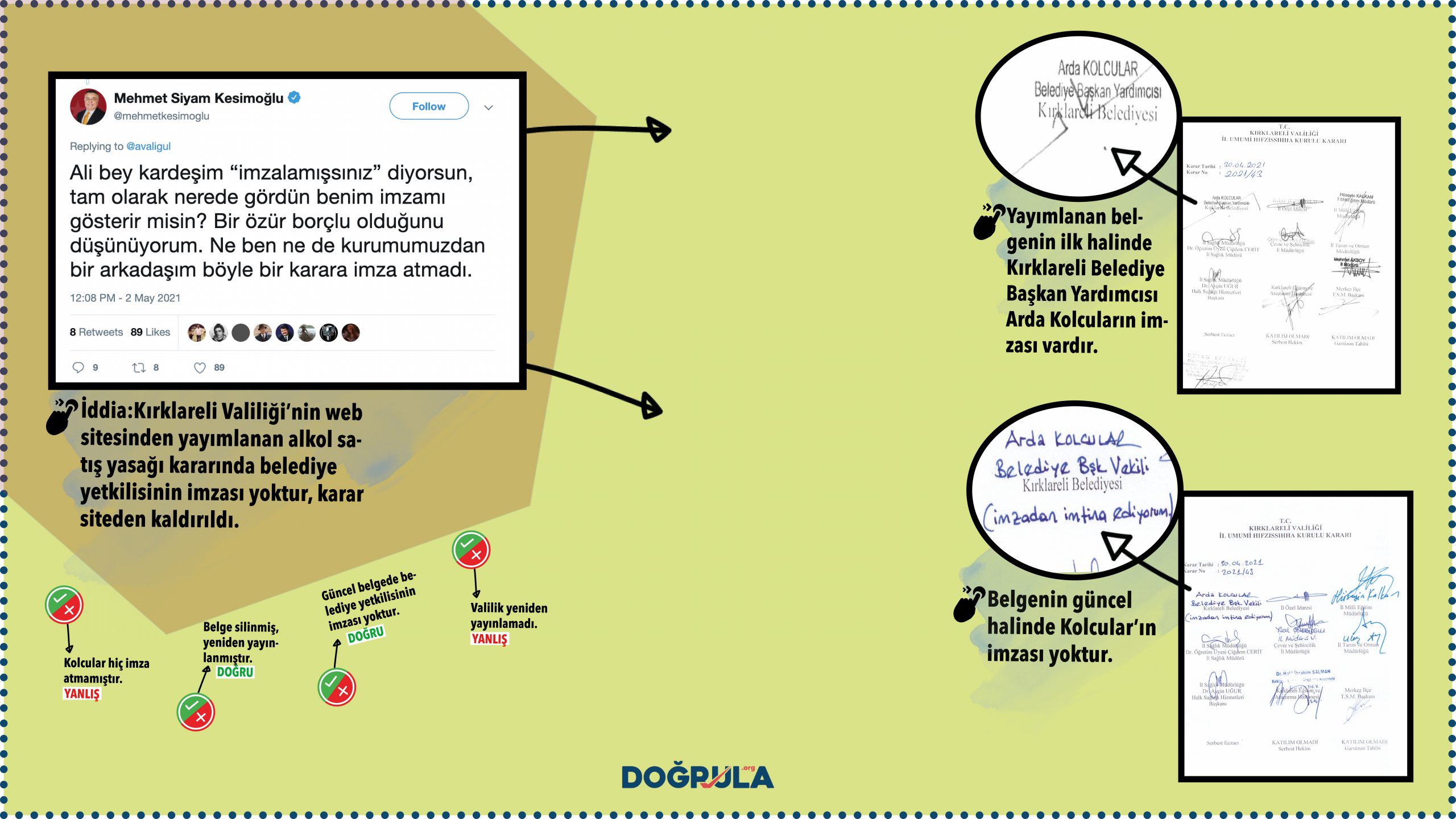 Valiliğin websitesindeki güncel kararda Belediye Başkanı Mehmet Siyami Kesimoğlu’na vekalet eden Belediye Başkan vekili Arda Kolcular’ın imzadan imtina ettiği görülüyor. Fakat, kararın yer aldığı belgenin değiştirildiği saptanmıştır. Wayback Machine’den kararın ilk yayınlandığı haline baktığımızda kararda Belediye Başkan vekili Arda Kolcular’ın imzasını görmekteyiz. Kırklareli Belediyesi’ni daha önce yayınladığı belgeler ile karşılaştırdığımızda Arda Kolcular’ın imzaları aynıdır.