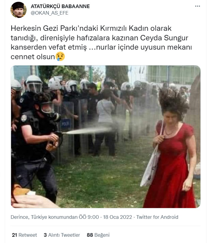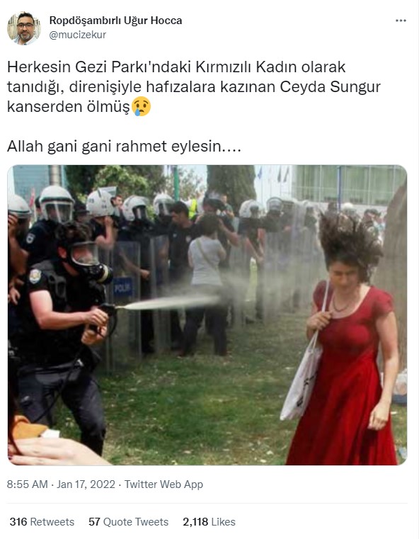 17 Ocak 2022 tarihinde sosyal medyada yapılan bazı kullanıcılar Ceyda Sungur’un hayatını kaybettiğini iddia etti. Ceyda Sungur Gezi Parkı protestolarında sembol haline gelmişti ve “Kırmızılı Kadın” olarak tanınmıştı. Protestolarda kendisinin bir fotoğrafı paylaşılmıştı. Fotoğrafta Ceyda Sungur’a biber gazı sıkılıyordu. Aşağıda fotoğrafı görebilirsiniz.