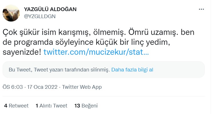 Yazar Yazgülü Aldoğan, Gezi Parkı protestolarından hatırladığımız ve ‘kırmızılı kadın’ olarak bilinen Ceyda Sungur’un hayatını kaybettiğini söyledi. Fakat, Sungur hayatını kaybetmediği sonucuna ulaştık. Aldoğan 2021 yılında kanserden hayatını kaybeden Olcay Senem ile Ceyda Sungur’u karıştırmış.