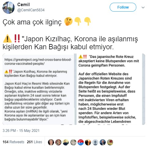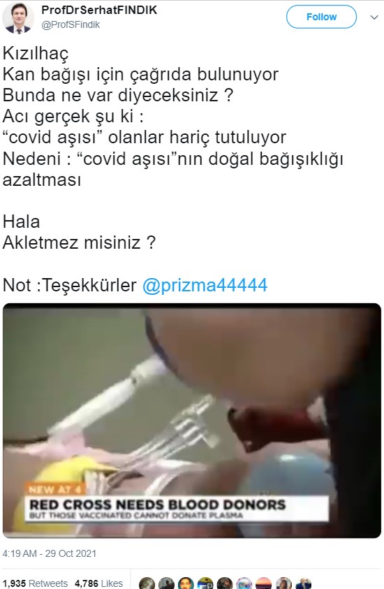 İddia Tweetinde Kızılhaç’ın aşı olmamış kişilerden kan istediği belirtilmiş.