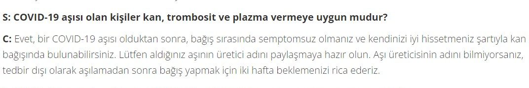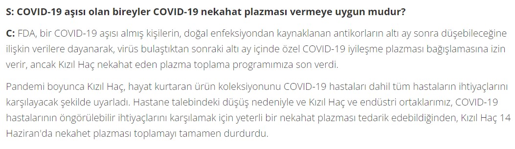 Görüldüğü üzere Kızılhaç, bu uygulamayı 14 Haziranda kaldırmış. İlgili web sitesinde kurum, aşı olan kişilerin kan, trombosit ve plazma bağışlaması konusunda herhangi bir sakınca olmadığını belirtmiştir.