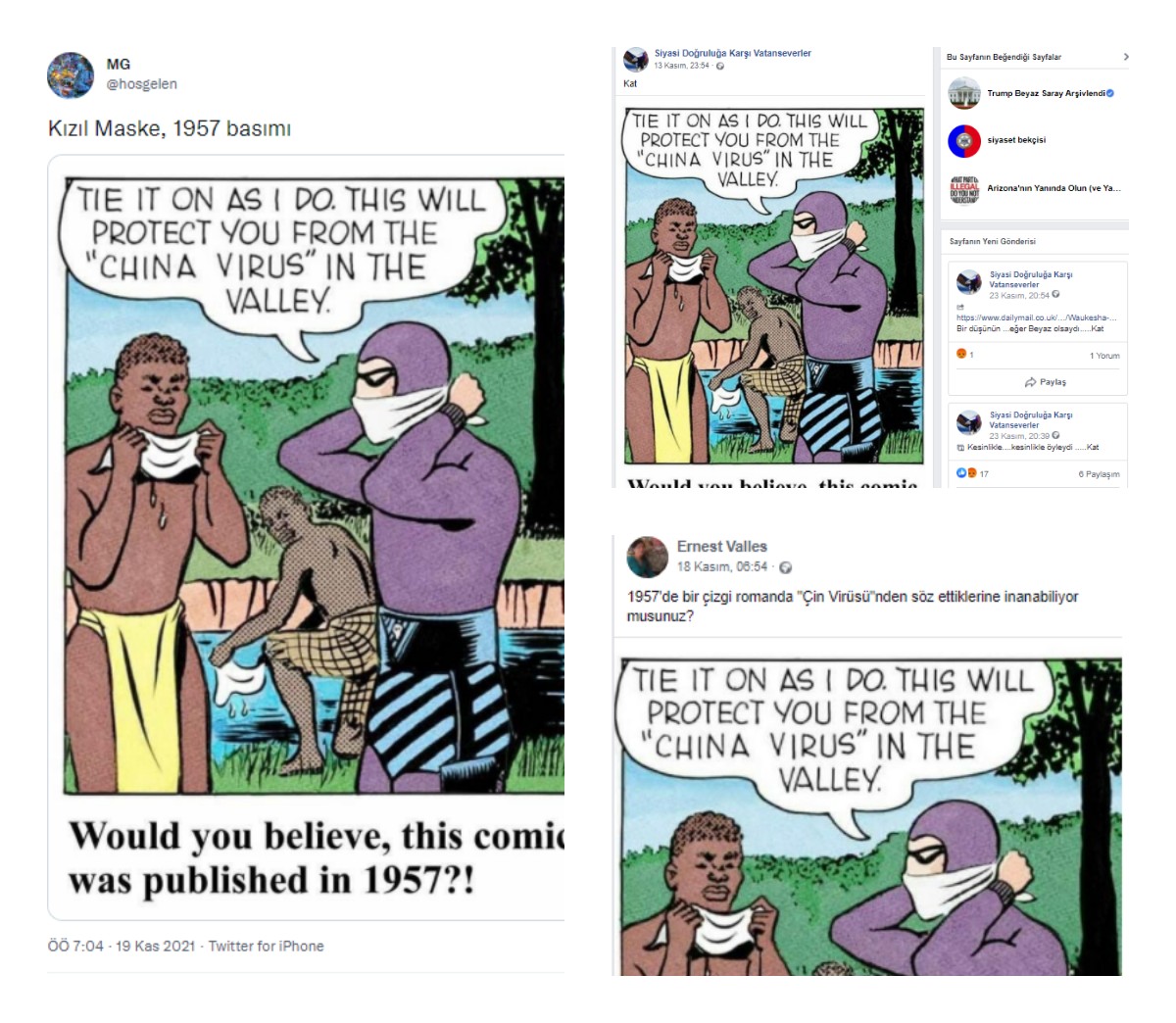 Sosyal medyada Kızıl Maske çizgi romanından paylaşılan görüntüde, romanın kahramanının ağzına bir bez parçası bağlaması dikkat çekiyor. Aynı zamanda kahramana ait konuşma balonunda, karşısındaki kişiye Çin Virüsü’ne karşı koruduğu için maske kullanılmasını tavsiye ettiği cümleler yer alıyor. Ancak gerçek hiç de görüldüğü gibi değil. Diyalog “Çin Virüsü” kelimelerini içerecek şekilde dijital olarak değiştirilmiş.