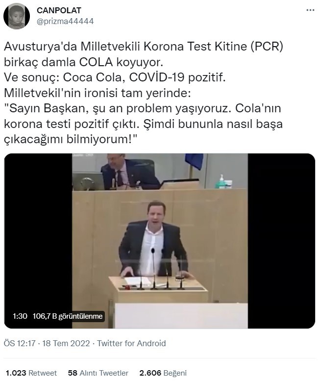Geçtiğimiz günlerde Twitter’da bir kullanıcının paylaştığı video, binlerce etkileşim almıştı. Bahse konu videoda, Avusturya milletvekili olduğu belirtilen bir kişinin, kola ile PCR testi üzerinde yaptığı deneyin “pozitif” sonuç verdiği belirtildi.