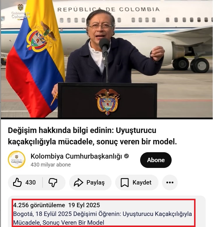 Videodan ekran görüntüsü alıp tersine görsel arama metodu ile incelememize başladık. Video, Kolombiya Cumhurbaşkanlığının YouTube hesabın üzerinden Eylül 2025’te paylaşılmış.