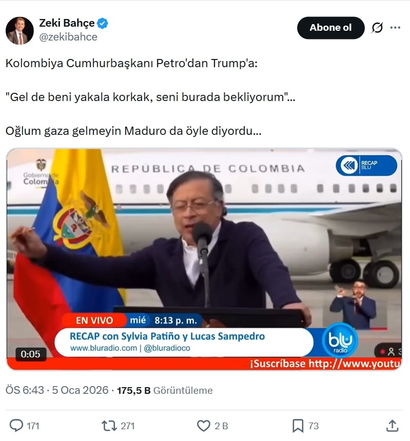 Venezuela Devlet Başkanı Nicolas Maduro’nun ABD tarafından yakalanıp ülkeden uzaklaştırılmasının ardından gözler diğer Güney Amerika ülkelerine çevrilmişken sosyal medyada dolaşıma giren bir video, Kolombiya Devlet Başkanı Gustavo Petro’nun ABD Başkanı Donald Trump’a “Gel beni yakala, korkak” dediği anları gösterdiği iddiasıyla paylaşıldı.
