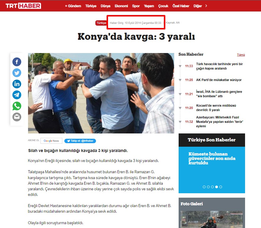 Fotoğraf; aynı yılın eylül ayında ise Konya’daki iki husumetli kişinin karşılaşıp tartıştığı, bu tartışmanın kavgaya evrildiğine dair haberde kullanılmış.