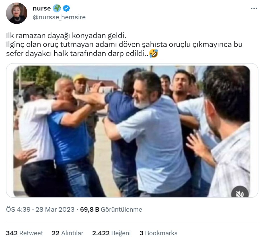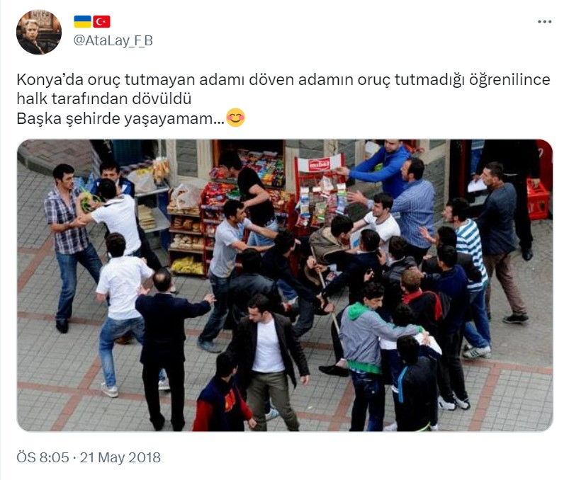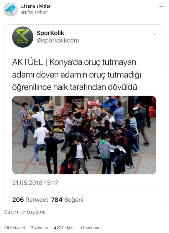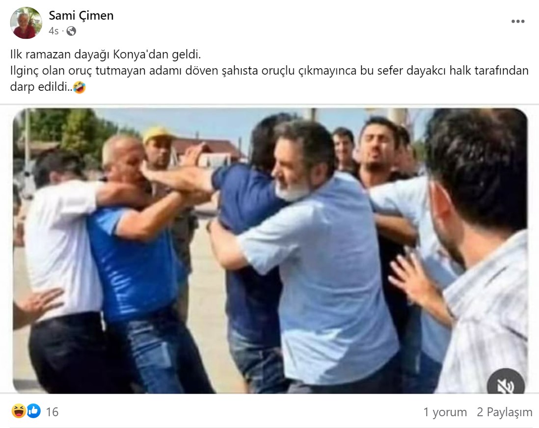“İlk Ramazan dayağı Konya’dan geldi. İlginç olan oruç tutmayan adamı döven şahıs da oruçlu çıkmayınca bu sefer dayakçı halk tarafından darp edildi.”