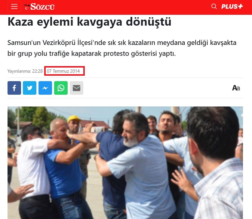 Ulaştığımız en eski haber 2014’ün temmuz ayından. İlgili haberde, fotoğrafın Samsun’da çekildiği belirtiliyor. Şehrin Vezirköprü ilçesinde sık sık kazaların yaşandığı bir kavşaktaki protestocu grup ile sürücüler arasında yaşanan tartışmanın kavgaya dönüştüğünden bahsedilmiş.