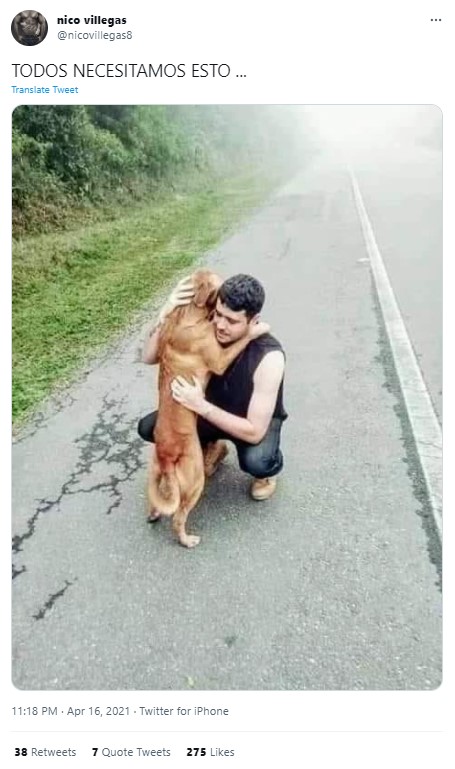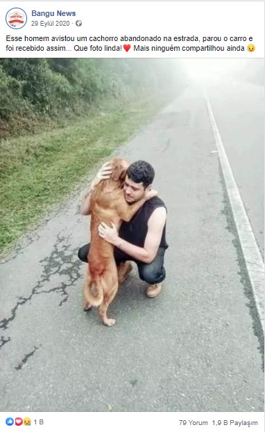 Paylaşımların birinde görselin hikayesine dair “Bu adam, yolda terk edilmiş bir köpek görmüş, arabayı durdurmuş ve böyle karşılanmış… Ne güzel bir fotoğraf!” ifadelerine yer verildiği görülüyor.