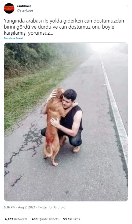 Sosyal medyada, günlerdir Türkiye’de süren orman yangınlarına ilişkin çeşitli görseller paylaşılmaya devam ediyor. Bunlardan biri de bir sosyal medya kullanıcısının “Yangında arabası ile yolda giderken can dostumuzdan birini gördü ve durdu ve can dostumuz onu böyle karşılamış, yorumsuz…” notuyla paylaştığı bir köpek ve bir adamın sarıldığı bir fotoğraf karesi…