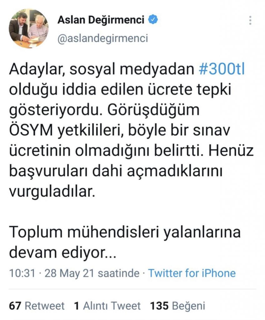 Tepkiler üzerine ÖSYM yetkilileri ile görüştüğü yönünde sosyal medya hesabında paylaşım yapan gazeteci-yazar Aslan Değirmenci; yetkililerin, henüz başvuruları dahi açmadıkları ve böyle bir sınav ücreti olmadığını belirttiklerini iddia etti.
