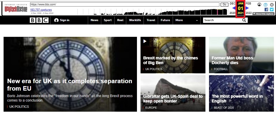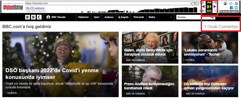 İddiayı kontrol etmek için BBC ana sayfasının arşiv görüntülerini inceledik. 1 Ocak 2022 tarihinde ve 1 Ocak 2021 tarihinde de logosunun siyah olduğu görülebiliyor. BBC, 2021’den bu yana şu andaki logosunu kullanıyor.