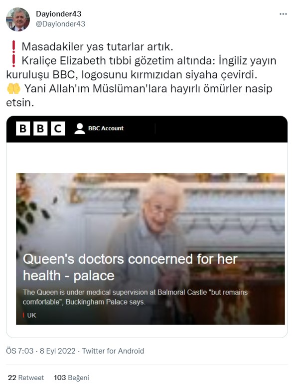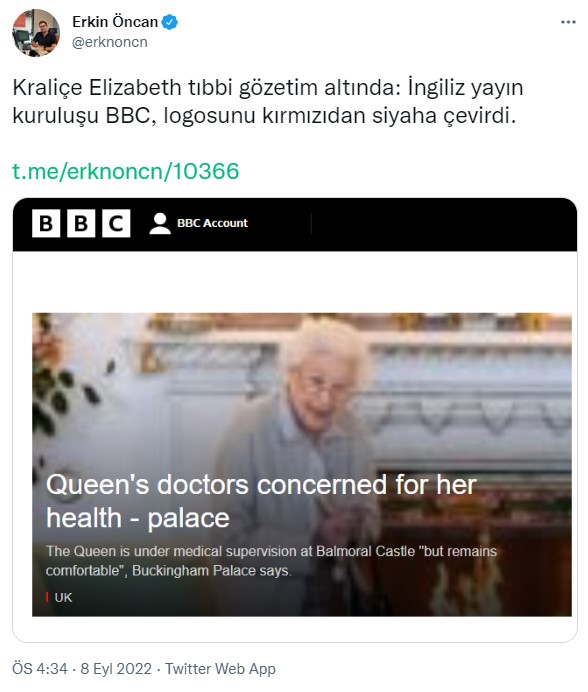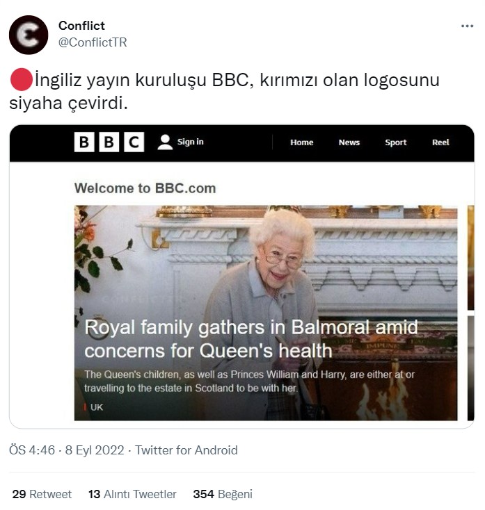 Kraliçe II. Elizabeth’in hastaneye kaldırılması ve vefatı tüm dünyanın gündem maddeleri arasına girdi. Sosyal medyada Kraliçe Elizabeth’in hastaneye kaldırılmasının ardından İngiltere merkezli haber ajandı BBC’nin logosunu kırmızdan siyaha çevirdiği iddia edildi.