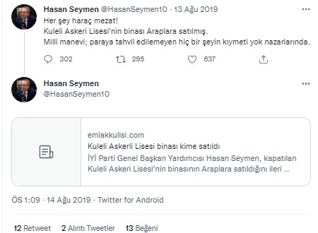 İddiayı o dönem İYİ Parti Genel Başkan Yardımcısı olan Hasan Seymen de 2019 yılında paylaşmıştı. Şu an Gelecek Partisi Yönetim Kurulu Üyesi olan Seymen, Twitter hesabından Emlak Kulisi’nin 2016’daki haberini kaynak göstererek tweet atmıştı.