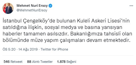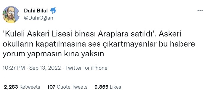 31 Temmuz 2016’da yayımlanan KHK ile Harp Akademileri, askeri liseler ve astsubay hazırlama okullarının kapatılması sonrasında Kuleli Askeri Lisesi binasının satıldığına yönelik iddialar ortaya çıkmıştı. Bu söylemi gündeme taşıyanlardan birinin de Emlak Kulisi olduğunu anlıyoruz.