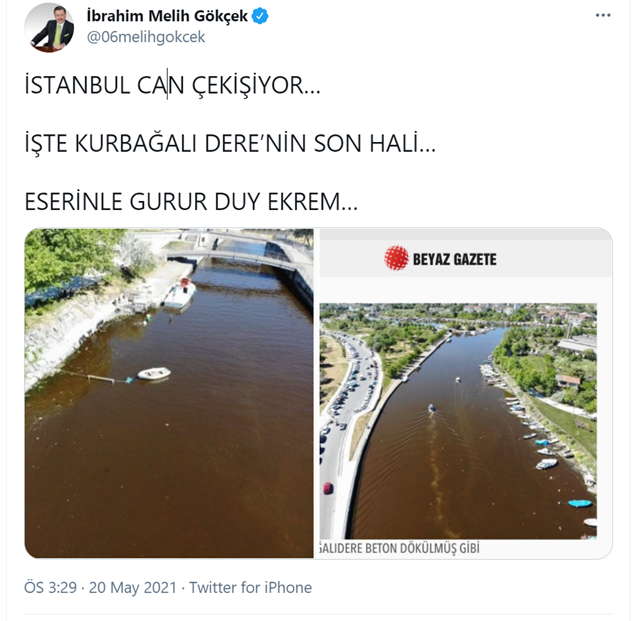 Ankara Büyükşehir Belediyesi eski başkanı Melih Gökçek bir tweetinde Kurbağalı Dere ’ye ait olduğunu iddia ettiği bir görseli yayınladı. Görsel aşağıdadır. Tweet’inde İstanbul Büyükşehir Başkanı Ekrem İmamoğlu’na “eserinle gurur duy” demiştir.