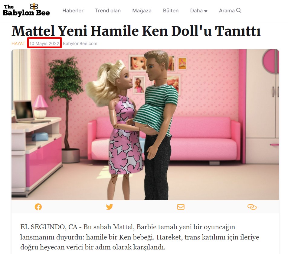 Videonun açıklama kısmına “Mattel, Onur Ayını kutlamak için ilk hamile erkek bebeğini piyasaya sürdü: Hamile Ken!” açıklamasını yazan The Babylon Bee, 2016 yılında kurulan muhafazakar Hristiyan bir parodi – hiciv sitesi.