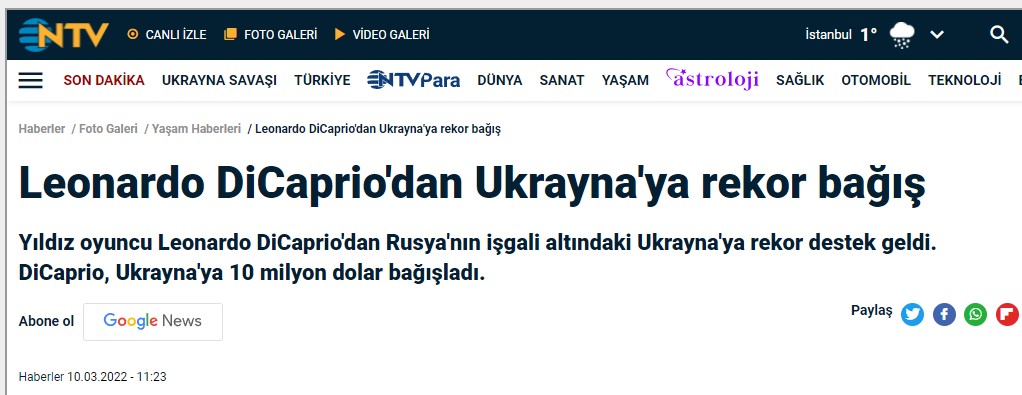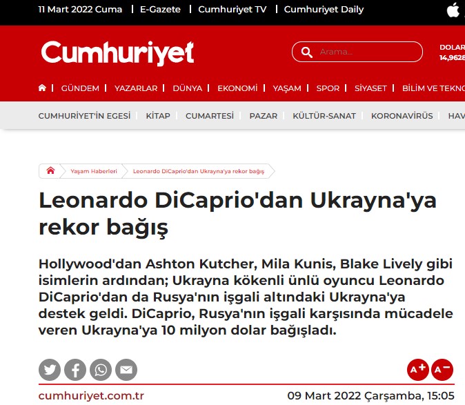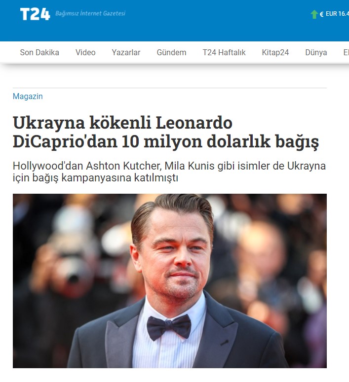 Ukrayna-Rusya krizi devam ederken gündeme gelen iddialardan birine göre ünlü oyuncu Leonardo DiCaprio’nun Ukrayna’ya 10 milyon dolar bağış yaptı. İddia, haber mecralarında ve sosyal medyada çokça paylaşıldı. Bağışın Uluslararası Visegrad Fonu üzerinden yapıldığı ve Visegard Fonu’nun DiCaprio’nun bağış yaptığını açıkladığı söylendi.