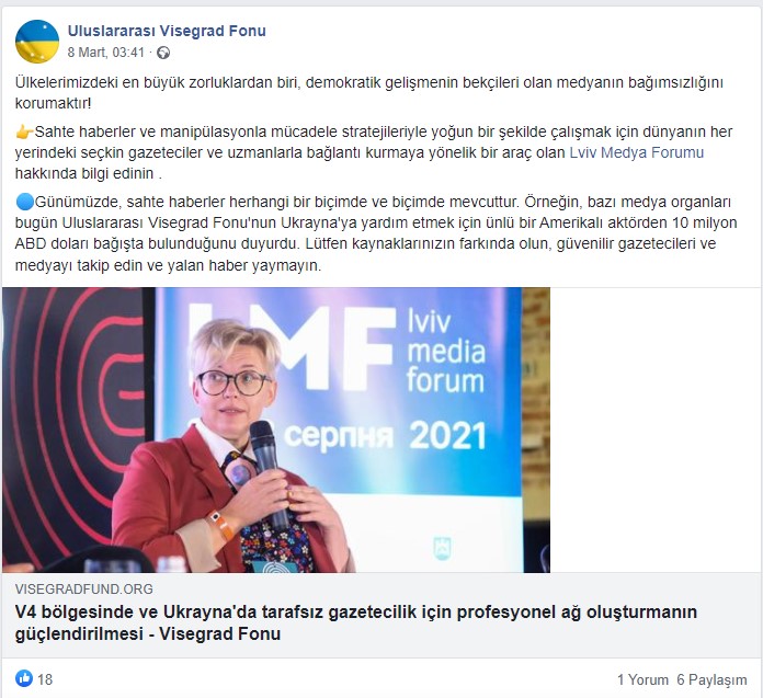 DiCaprio’nun bizzat kendisinin ya da Uluslararası Visegard Fonu’nun DiCaprio’nun bağış yaptığını açıklayan herhangi bir paylaşımına ulaşamadık. Dahası, Uluslararası Visegard Fonu, konuyla ilgili bir açıklama yaptı. Organizasyon DiCaprio’nun ismini vermeden Amerikalı ünlü bir aktörün 10 milyon dolar bağış yaptığını yalanladı ve haber mecralarının yalan haber yaymamaları konusunda uyardı.