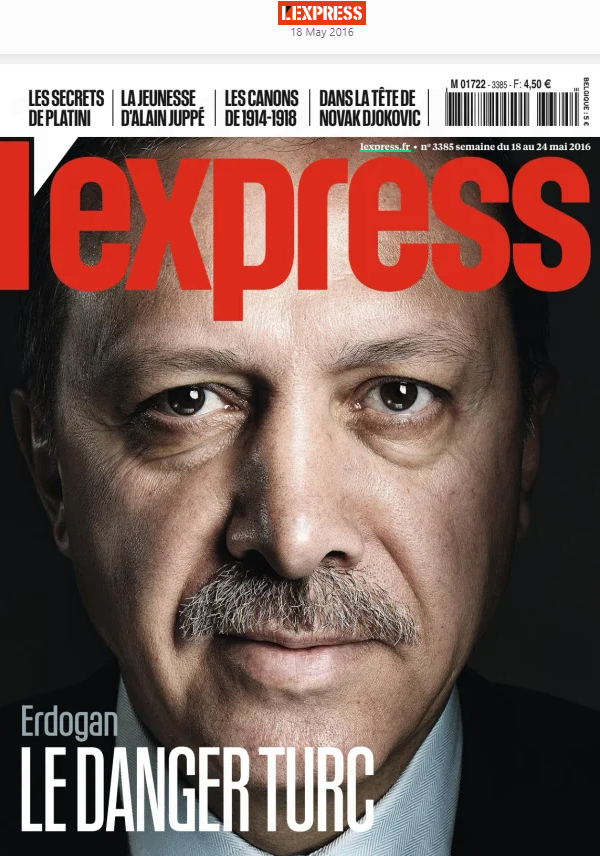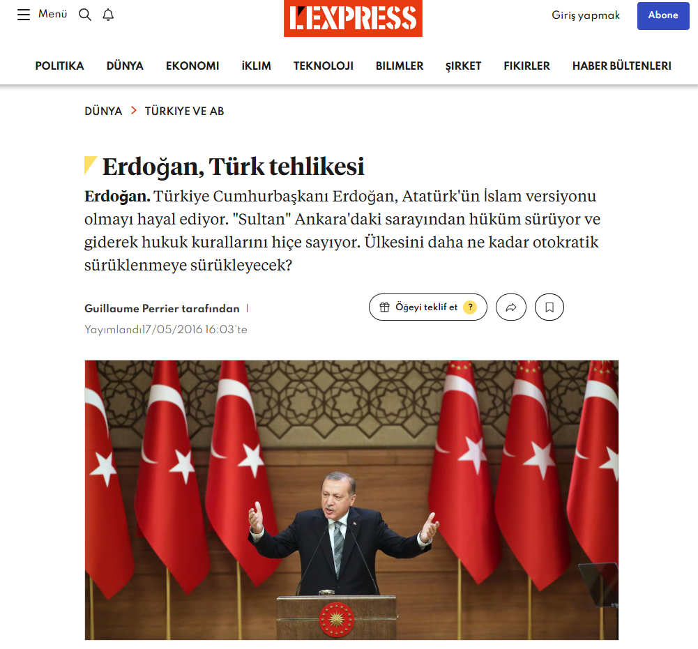Fransız dergi L’Express, Mayıs 2016’da Erdoğan’dan “Türkiye’nin tehlikelisi” şeklinde bahsetti. 17 Mayıs 2016’da Guillaume Perrier imzalı ve adı geçen başlıklı yazı yayımlanmış. Perrier bu yazıda Erdoğan için “Atatürk’ün İslami versiyonu olmayı hayal ediyor.” gibi iddialı cümleler kullanmış ve cumhurbaşkanından “sultan” olarak bahsetmiş.