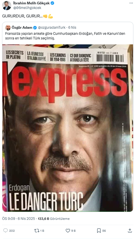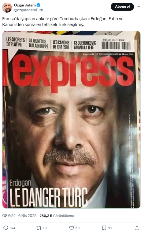 Sosyal medyada, Fransız L’Express dergisinin Cumhurbaşkanı Recep Tayyip Erdoğan’ı kapağına taşıdığı sayısı paylaşılıp dergide yapılan ankete göre kendisinin “Fatih Sultan Mehmet ve Kanuni Sultan Süleyman’dan sonra en tehlikeli Türk” seçildiği iddia edildi.