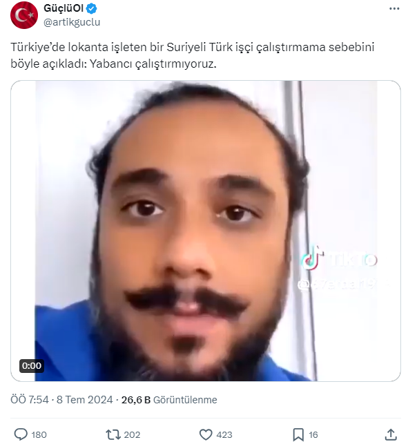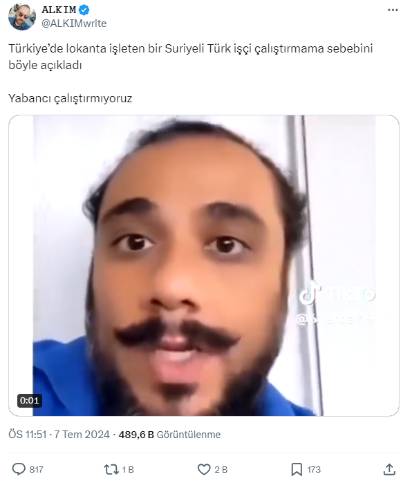 Sosyal medyada hızla yayılan ve kısa sürede viral haline gelen bir video paylaşımda, Suriyeli olduğu öne sürülen şahsın “Türk vatandaşı gelmiş benim Suriye lokanta iş istiyor. Bana iş ver. Ben dedim yabancı çalıştırmıyorum, kusura bakma. Sonra bana kızıyor. Neden bana kızıyor, ben yabancı çalıştırmak istemiyorum.” ifadelerini kullandığı görülüyor.
