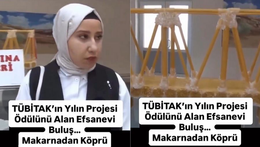 Sosyal medyada paylaşılan bir videoda masa üzerinde sergilenen “makarnadan yapılmış köprü” görüntüleri ve öğrencilerin verdikleri röportajlar “TÜBİTAK tarafından desteklenen bir proje”nin görüntüleri olduğu iddiasıyla paylaşıldı.