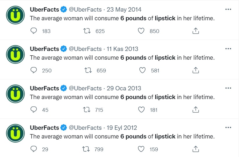 Yalnızca ülkemizde değil yurt dışında da bu iddia, oldukça yaygınlık kazanmış. Örneğin Twitter’da milyonlarca takipçisi olan @UberFacts adlı sayfada aynı iddia farklı tarihlerde tekrarlanmış.