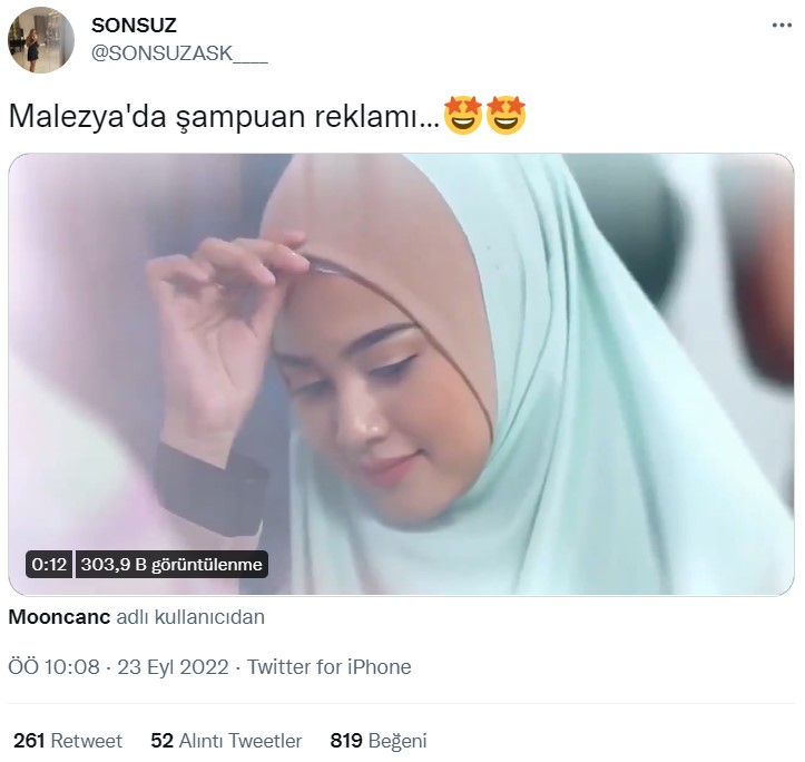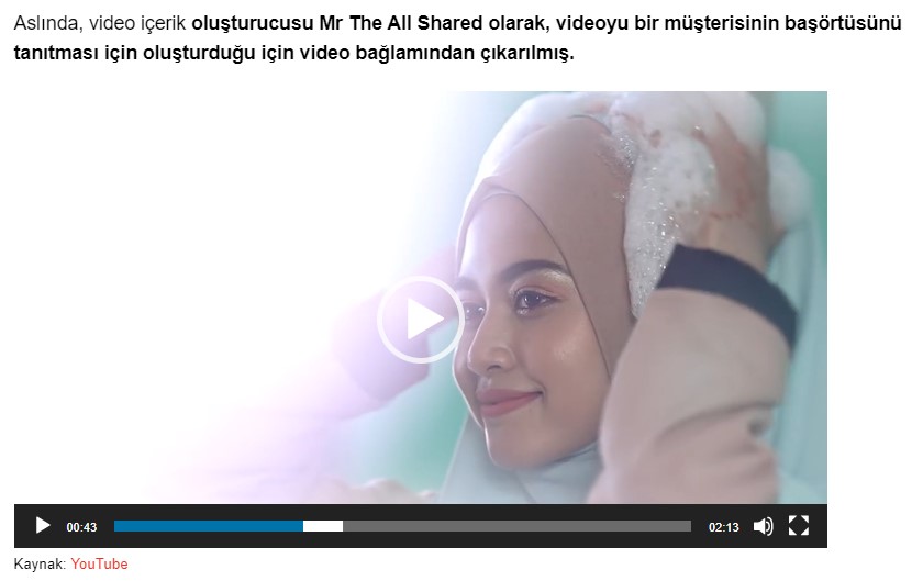 Twitter’da bir kullanıcının paylaştığı video, kısa sürede etkileşim aldı. Tesettürlü bir kadının başörtüsüne şampuan sürüp köpürttüğü anı gösteren videonun, Malezya’da bir şampuan reklamı olduğu iddia edilmiş.