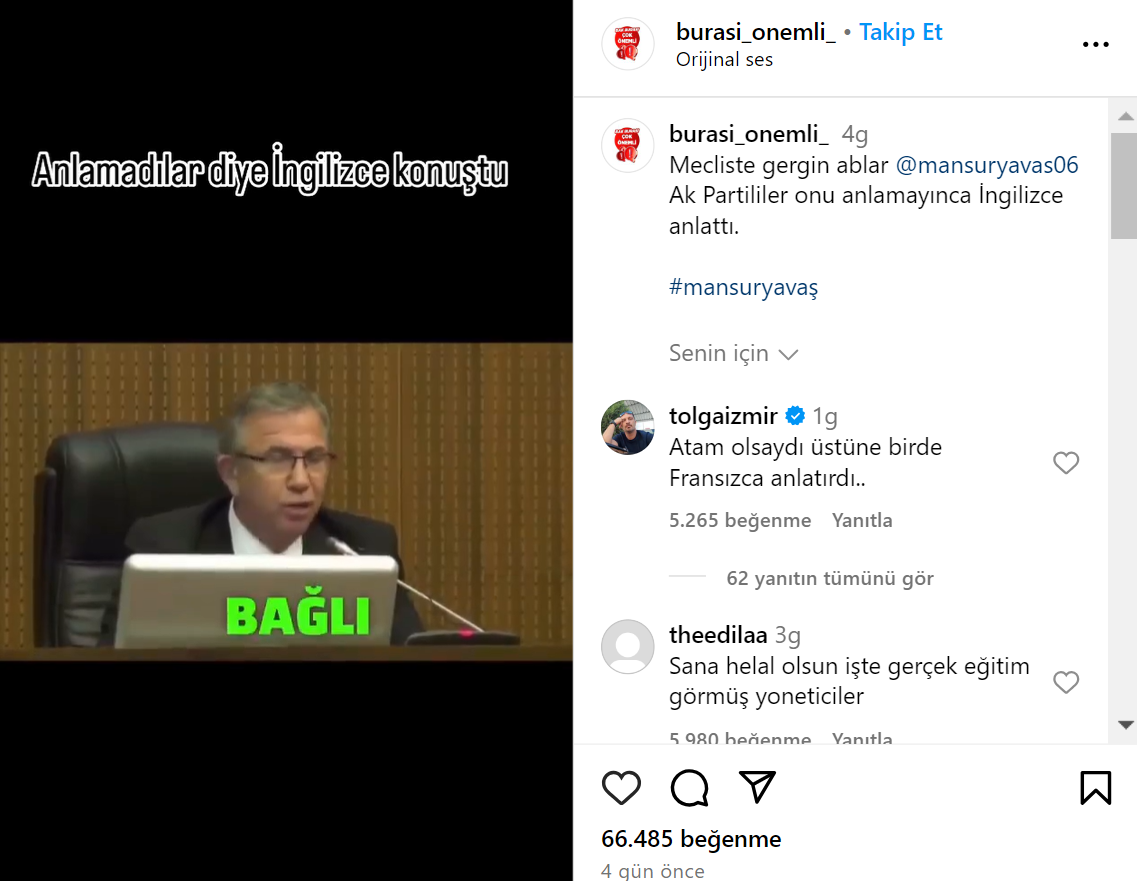 Ankara Büyükşehir Belediye Başkanı Mansur Yavaş’ın İngilizce konuştuğunu gösterdiği iddiasıyla paylaşılan bir video sosyal medyada son derece ilgi gördü. 2 milyondan fazla izlenen video on binlerce beğeni aldı. Yorum kısmına baktığımızda da videonun doğru olduğunu düşünen kişi sayısının azımsanmayacak kadar çok olduğunu gördük. Tüm bu sebepler dolayısıyla söz konusu iddiayı inceledik.