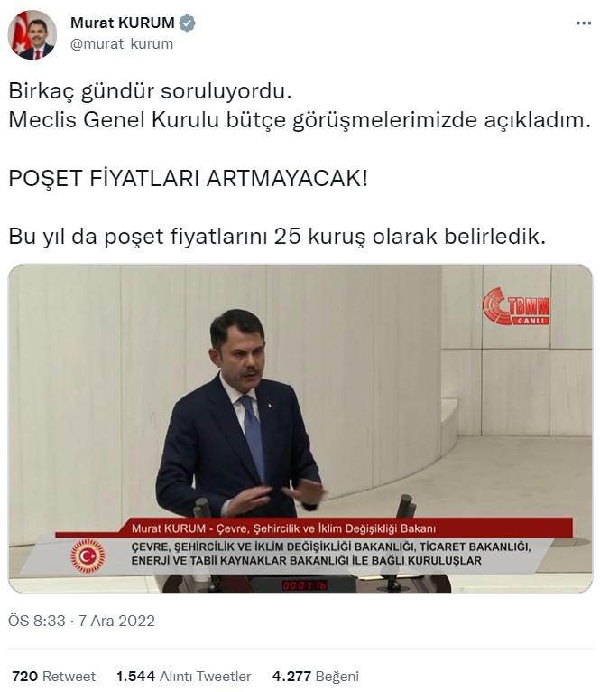Çevre, Şehircilik ve İklim Değişikliği Bakanı Murat Kurum, TBMM Genel Kurulunda, Bakanlığının 2023 yılı bütçesine ilişkin yaptığı konuşmasında, poşet fiyatlarında herhangi bir artışa gidilmeyeceğini ifade etmişti.