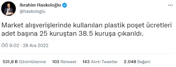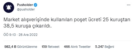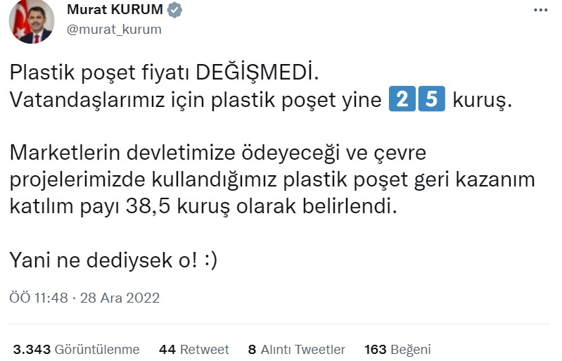 Çevre, Şehircilik ve İklim Değişikliği Bakanı Murat Kurum da sosyal medyada yayılan iddiaya ilişkin açıklama yaparak, plastik poşet fiyatının değişmediğini, vatandaşların ödeyeceği tutarın 25 kuruş olarak devam edeceğini belirtti.