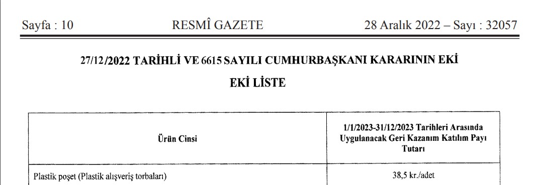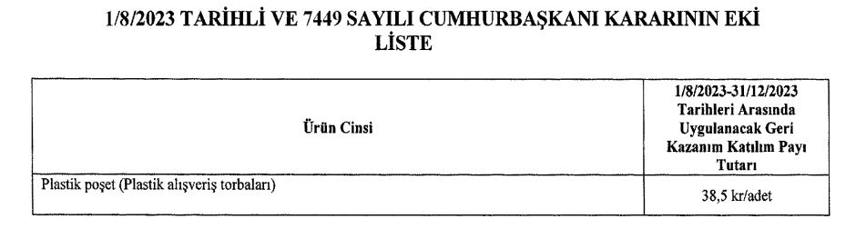 2 Ağustos 2023 tarihli Resmi Gazete’ de yayımlanan kararla plastik poşet geri kazanım katılım payının 38,5 kuruş olarak sabit kaldığı ve değişikliğe gidilmediği anlaşılıyor.